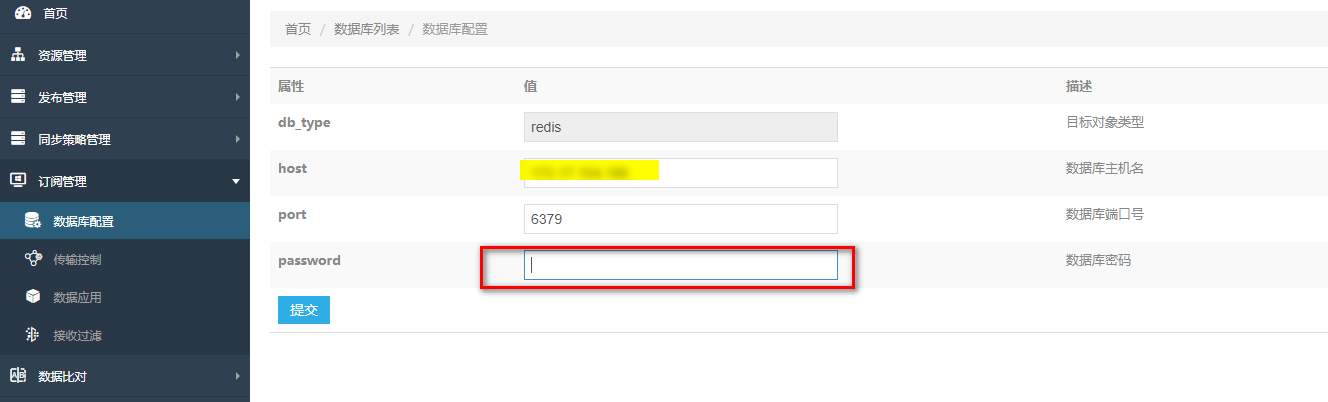 (2)如果设置了密码,则数据库配置密码部分输入相应密码;如果没有设置密码,则密码设置为空,程序不会执行auth校验密码命令,不会影响数据订阅