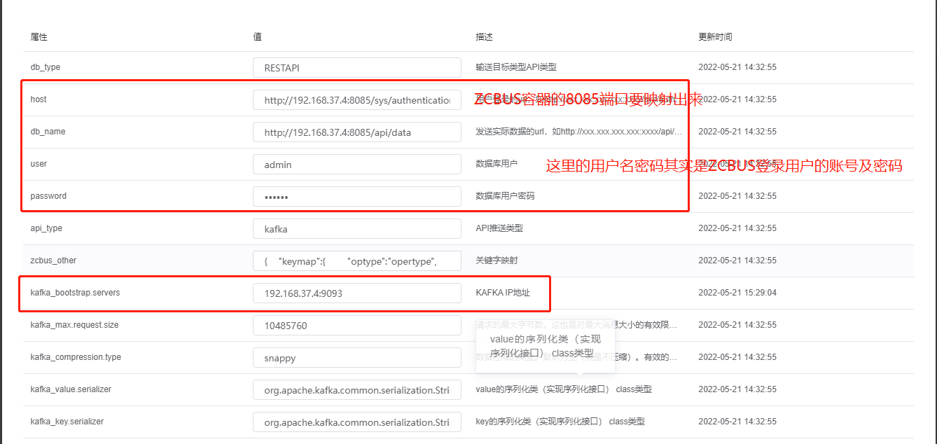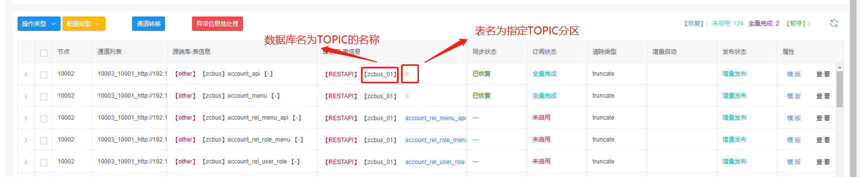 目录 搜索 ZCBUS 2.0关于ZCBUS 2.0ZCBUS 2.0简介ZCBUS 2.0 与 1.0区别ZCBUS 2.0新特性高可用&负载均衡支持列表使用限制法律声明快速入门自动化安装Kafka集群安装需求容器化安装(安装方便)非容器化部署MYSQL/KAFKA安装参考本地部署集群安装arm集群安装服务安装交换服务MYSQL/KAFKA外挂服务模式名词解释启用firewalld并部署ZCBUSWEB浏览器支持client模式安装云上云下数据交换模型docker环境修改为非root用户维护使用安装指南数据交换模型数据集中模型跨IDC数据交换模型远程数据分发模型日志监控服务OS 兼容CENTOS兼容麒麟操作系统兼容ZCBUS高级模式安装实时监控日志监控管理指南简要说明容器发布实时ORACLEXSTREAMS配置LOGMNR配置支持说明OGG配置MYSQL配置SQLSERVER配置手动关闭SQLSERVER CDC手动注册SYBASE配置FILE_BATCH配置FILE配置MONGODB配置DAMENG配置TDSQL配置OceanBase(for mysql)配置OcealBase(for oracle)配置OPEGAUSSDBPOSTGRESQLPanWeiDBTELEPGPOSTGRESQL配置PG分区表-内置分区表KingbaseES V8 (R3)配置KINGBASEGAUSSDB定时发布定时任务添加DB2INFORMIX达梦HANAYASHANCLICKHOUSE发布节点监控跨IDC发布离线文件发布注意事项策略管理数据处理函数说明使用(测试)说明数据转换订阅端配置数据转换逻辑(update)数据转换配置[新版]订阅KAFKA数据库配置通道配置数据应用HIVEHBASEUDALMONGODBOeanbase-mysqlROCKETMQRABBITMQREDISRESTAPIRESTAPI_FILERESTAPI_KAFKAupdate转delete+insert操作逻辑DB2HANAKAFKAKAFKA_V1.0KAFKA_V2.0非认证模式SASL认证v1.0 升级到 v2.0KERBEROS认证KAFKA_V3.0TOPIC使用管理表级别分区设置API客户端(service后台进程)YASHANDBFILEORACLEDATAHUB订阅节点监控比对ETL数据比对链路追踪路由网络配置(netmap路由)工具目录结构及文件说明导出导入数据比对kafka工具SSH互信自动创建工具目录结构及文件说明DDL翻译消息管理邮件告警配置系统参数任务计划网闸的发布和订阅优化调整手册二次开发手册SDK发布开发模式兼容组件服务模式兼容SDK数据处理SDK订阅常见问题附加日志命名规则123 暂无相关搜索结果! 本文档使用 MinDoc 发布 RESTAPI_KAFKA RESTAPI_KAFKA1、数据库管理配置2、订阅配置RESTAPI_KAFKARESTAPI_KAFKA可用于将平台内的数据送入到客户指定的KAFKA集群内,内容格式为JSON串1、数据库管理配置填写完成后,截止2022/5/21时,点击进行测试连接操作,会提示异常,因暂时未适配该驱动2、订阅配置文档更新时间: 2022-05-20 23:49 作者:操李红