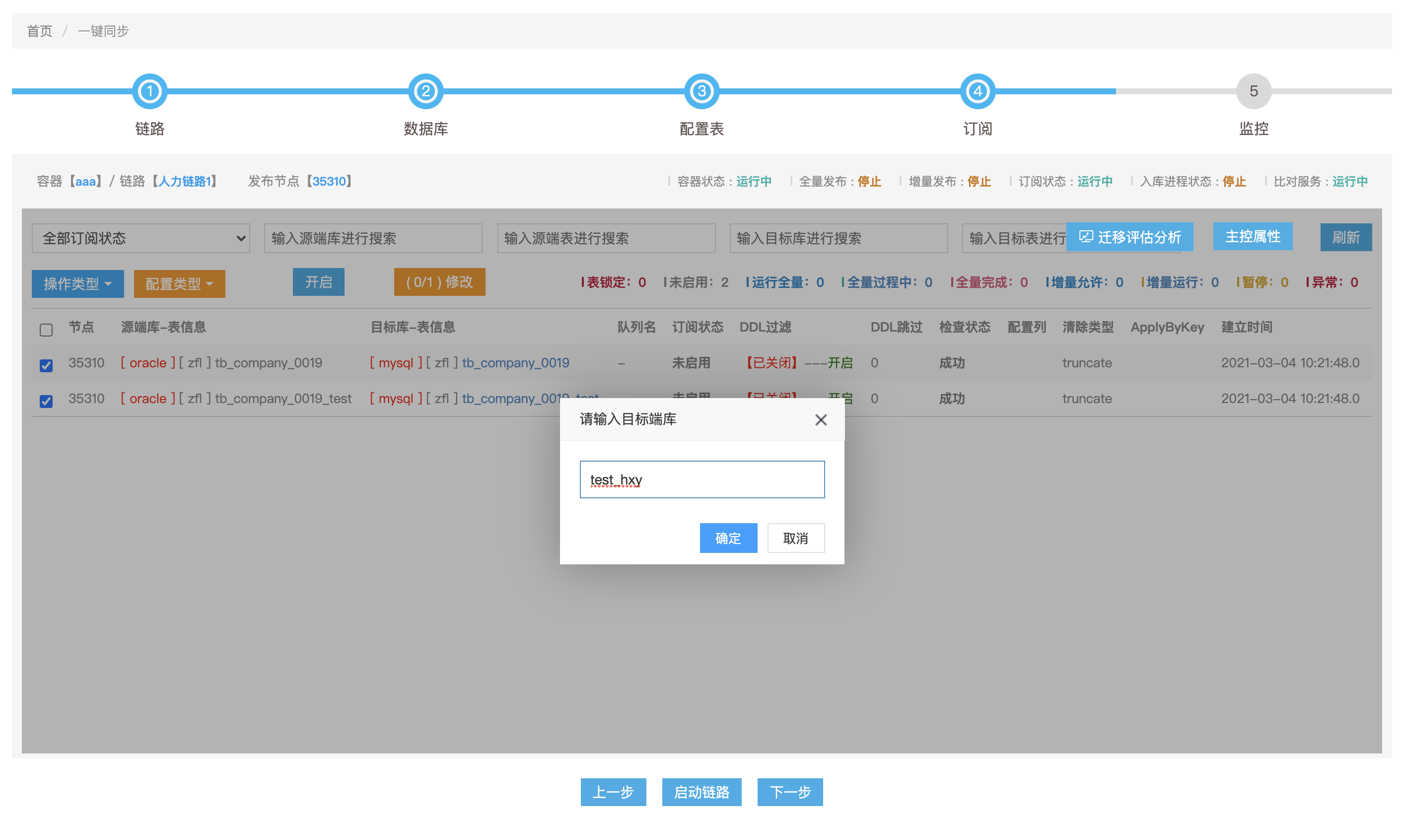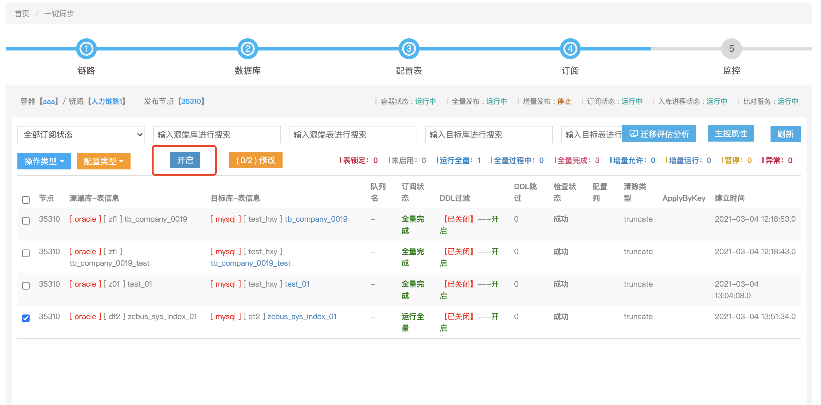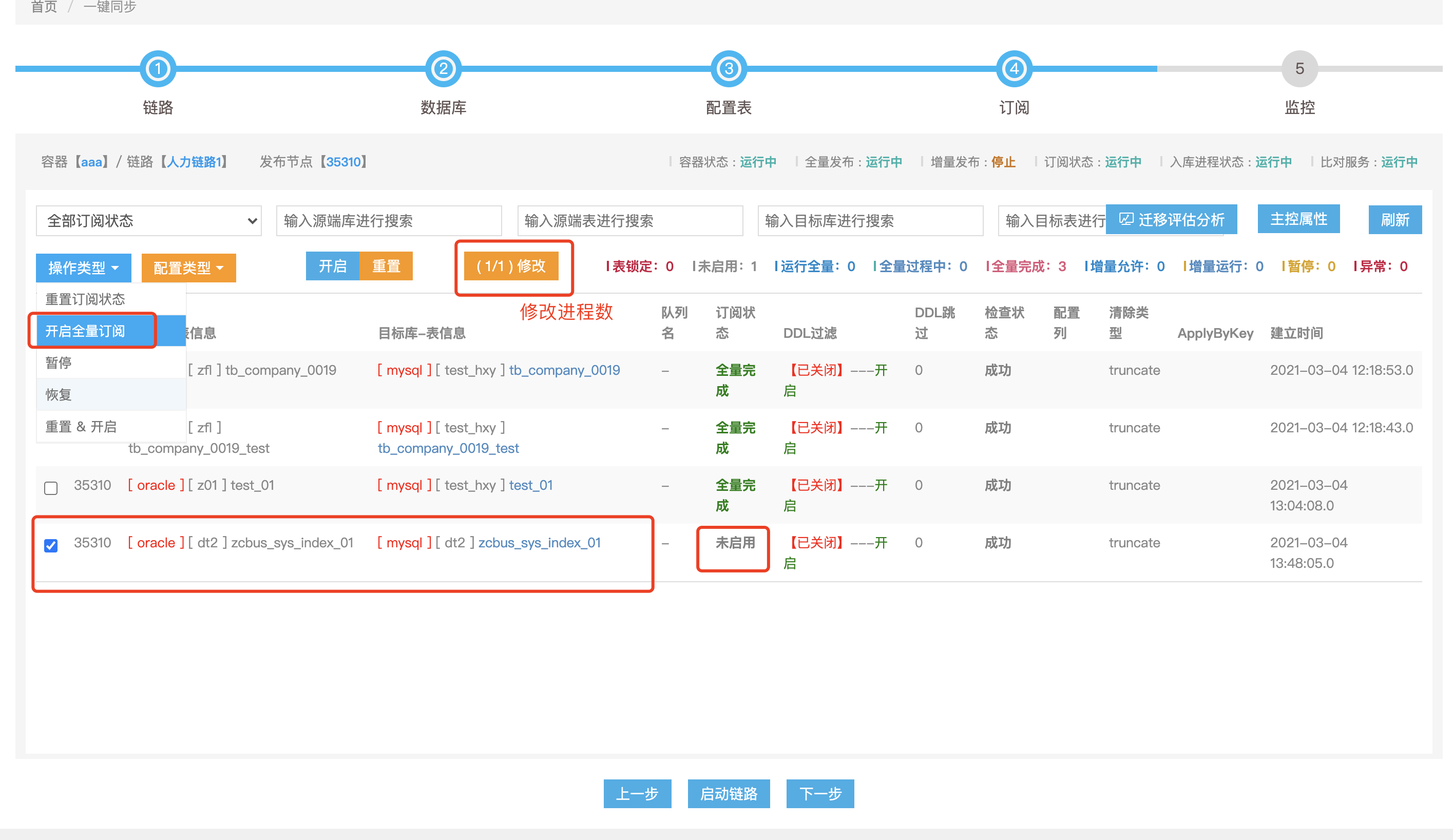 选中要同步的表,先开启全量定阅,修改进程数需先确保订阅状态为停止。