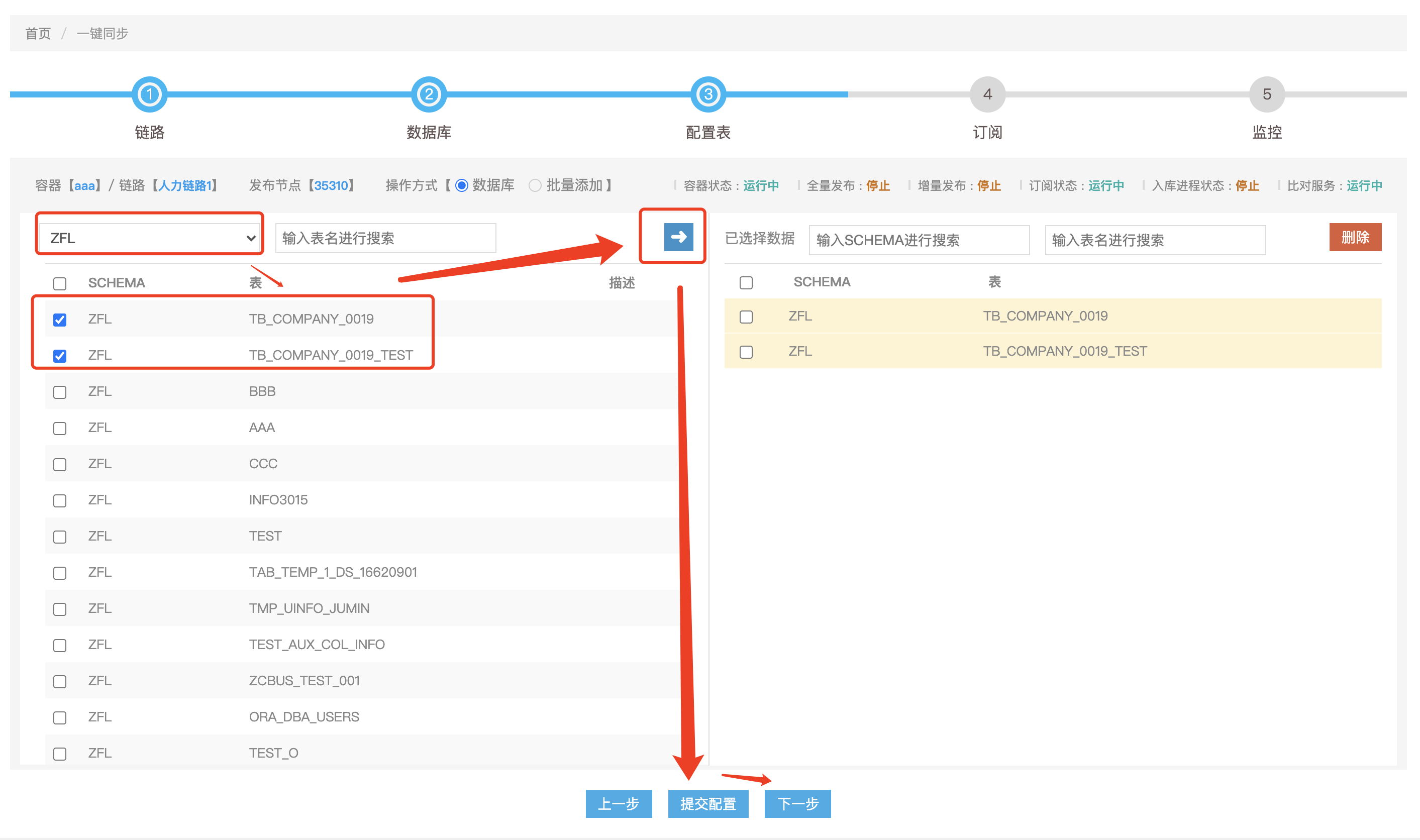 选择要迁移或者同步的schema,选择要同步的表,提交配置后点下一步