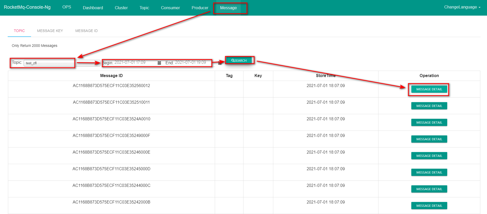 选择topic—>指定时间段—>点击搜索按钮—>点击详细消息按钮
