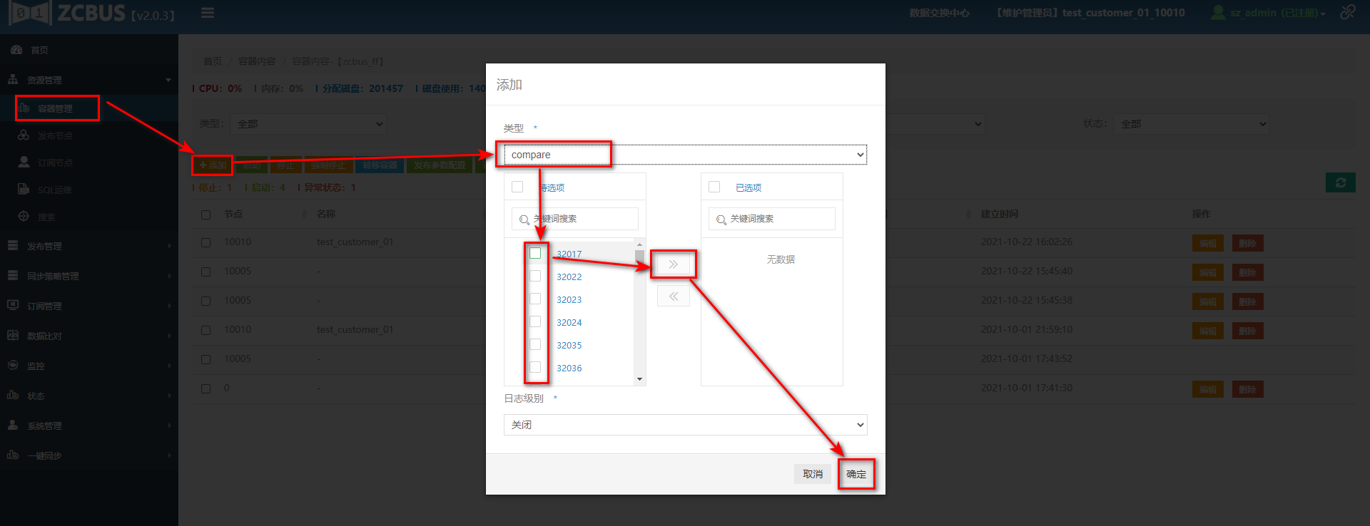 云端:容器管理—>双击进入相应容器—>添加—>选择compare类型—>勾选比对节点—>点击>>箭头—>确认