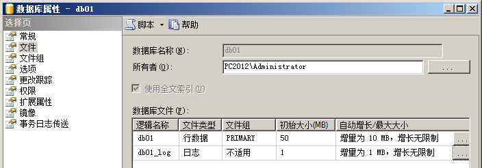 测试数据库名为db01,恢复模式设为简单。mdf与ldf文件初始状态如下: