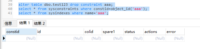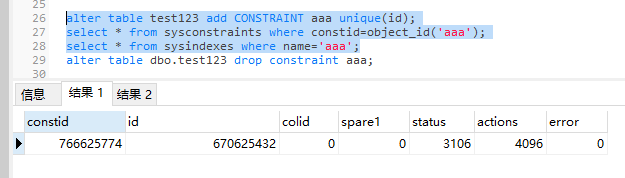 select * from sysconstraints where constid=object_id('aaa');