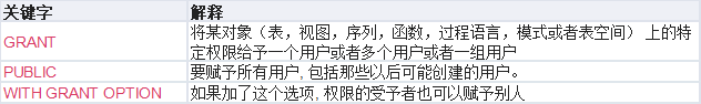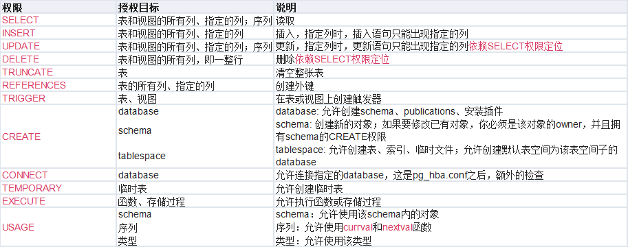 • 数据库级的权限有create、connect、temporary/temp三种