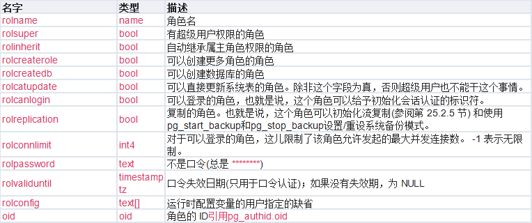pg_roles表字段