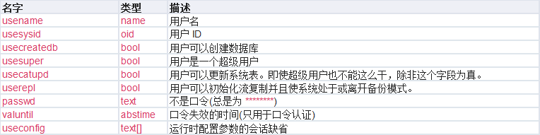pg_user表字段