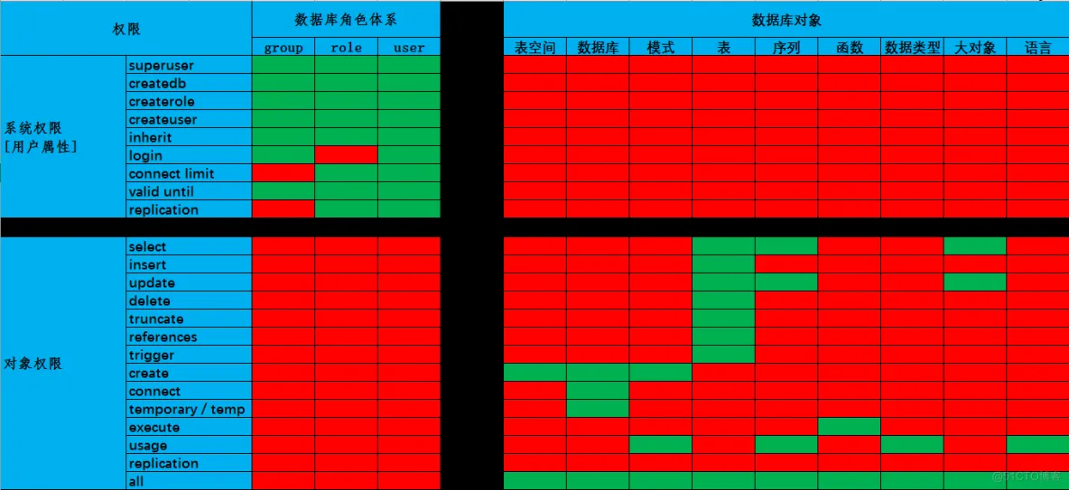 - 数据库:connect,temp/temprary权限,与模式无关