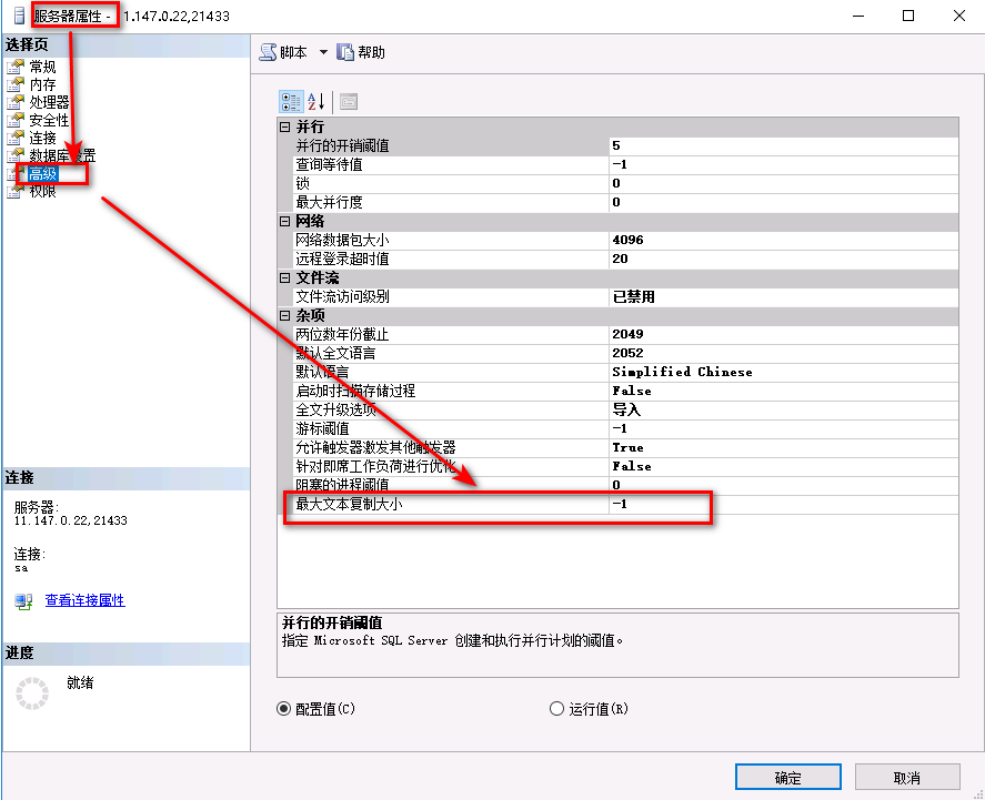 执行Sql语句: 错误描述:[审核数据] 错误信息:要复制的 LOB 数据的长度(93794)超出了配置的最大值 65536。请使用存储过程 sp_configure 为 max text repl size 选项(默认值为 65536)增加配置的最大值。配置值为 -1 表示无限制,其他值表示由数据类型施加限制。 SQL:Insert Into YXLIS2021..TBJY5FT01