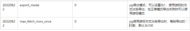 INSERT INTO `bus_parameter_module`( `module`, `moduletype`, `role`, `orderid`, `variable_name`, `display_name`, `value`, `ifcommon`, `input_type`, `hide`, `ifedit`, `ifciphertext`, `description`) VALUES ('bus_push_db_parameter', 'POSTGRESQL', 0, 43, 'export_mode', '导出模式', '0', 1, 0, 1, 1, 0, 'pg导出模式,可以设置为1,使用游标的方式分段导出,在正常模式导出失败时可以使用游标模式');