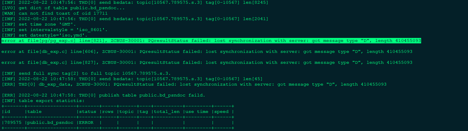 error at file[pg/pg_exp.c] line[821], ZCBUS-30001: PQresultStatus failed: lost synchronization with server: got message type “D”, length 410455093