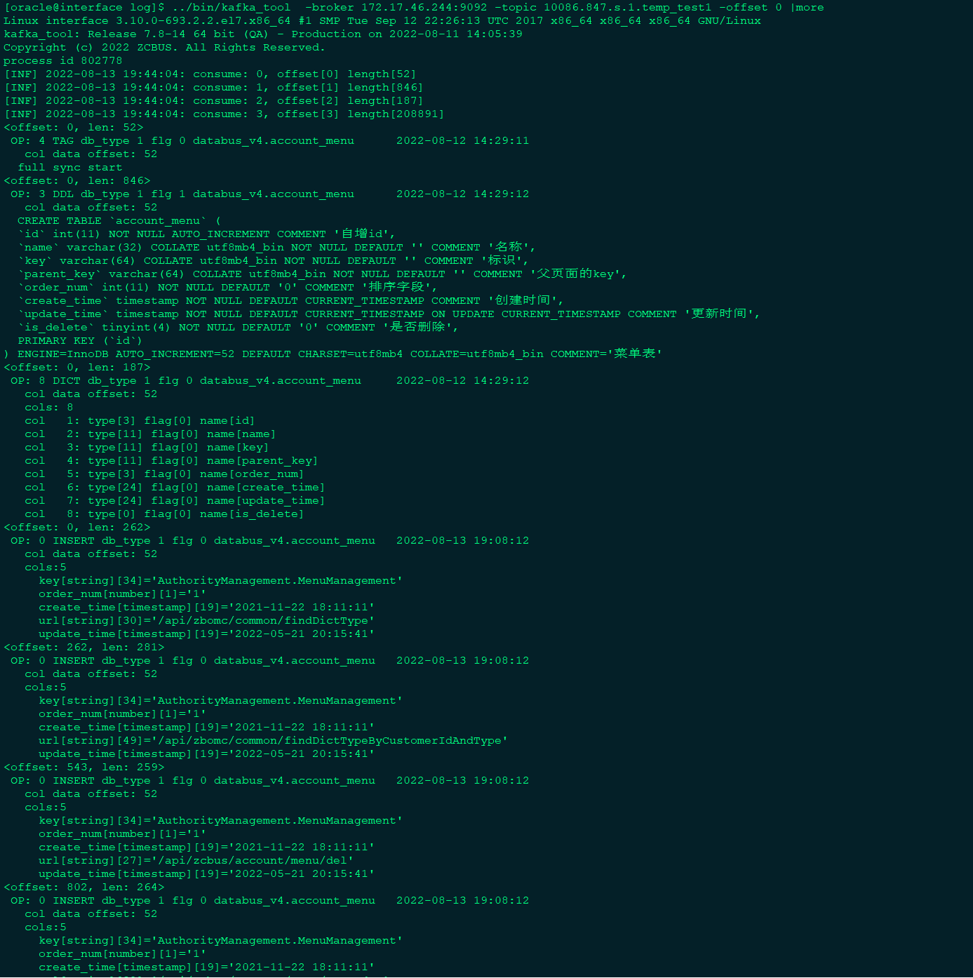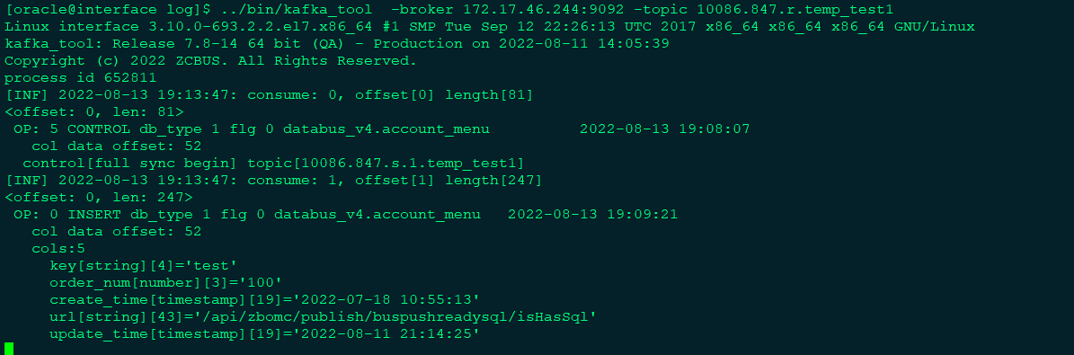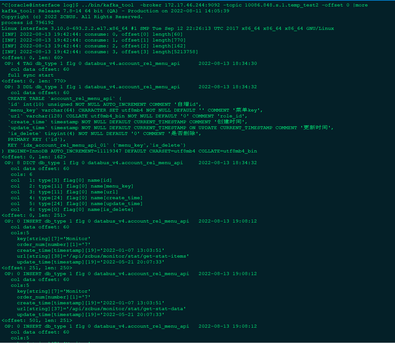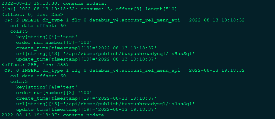 a表增量insert操作topic部分信息: