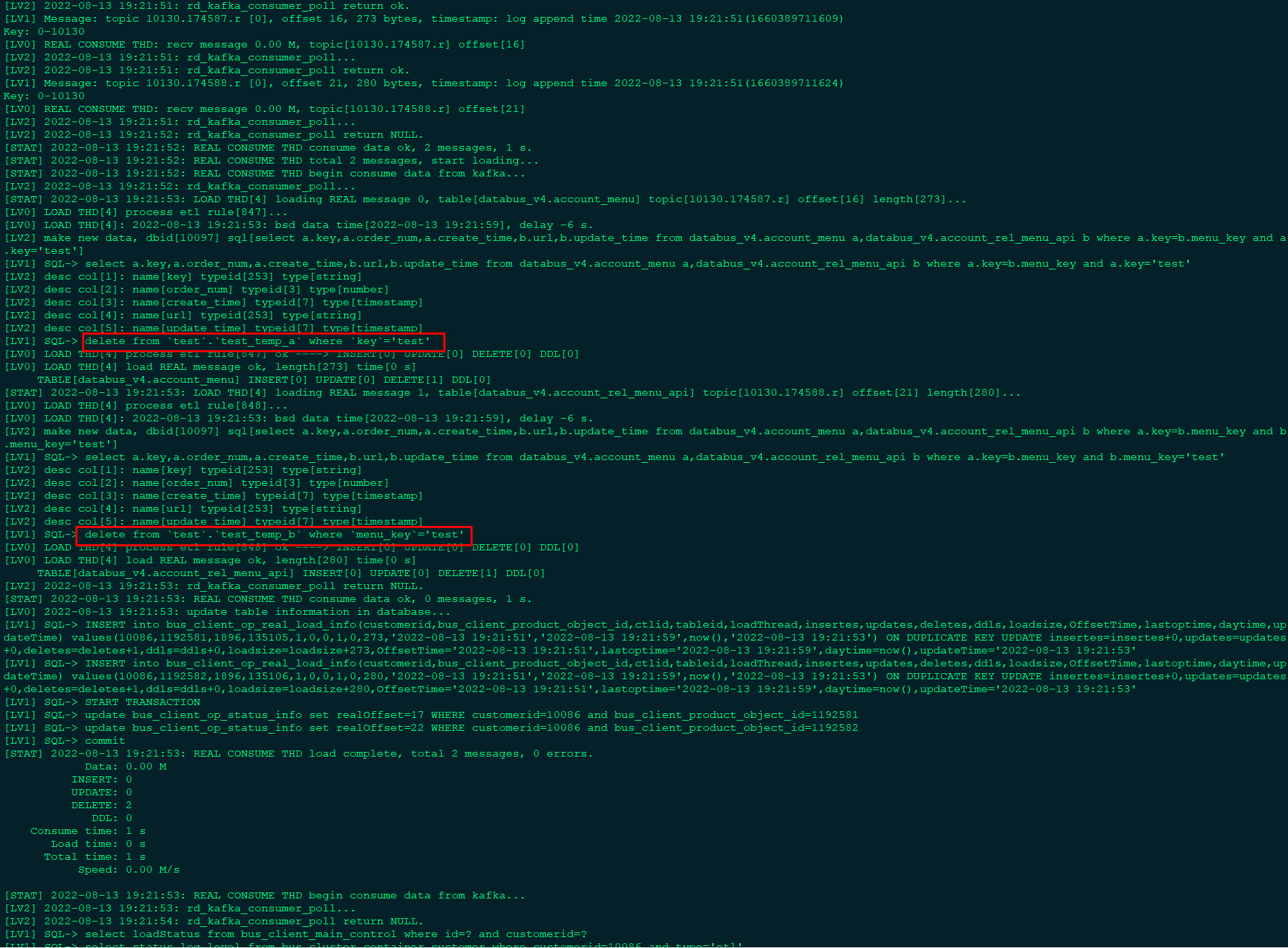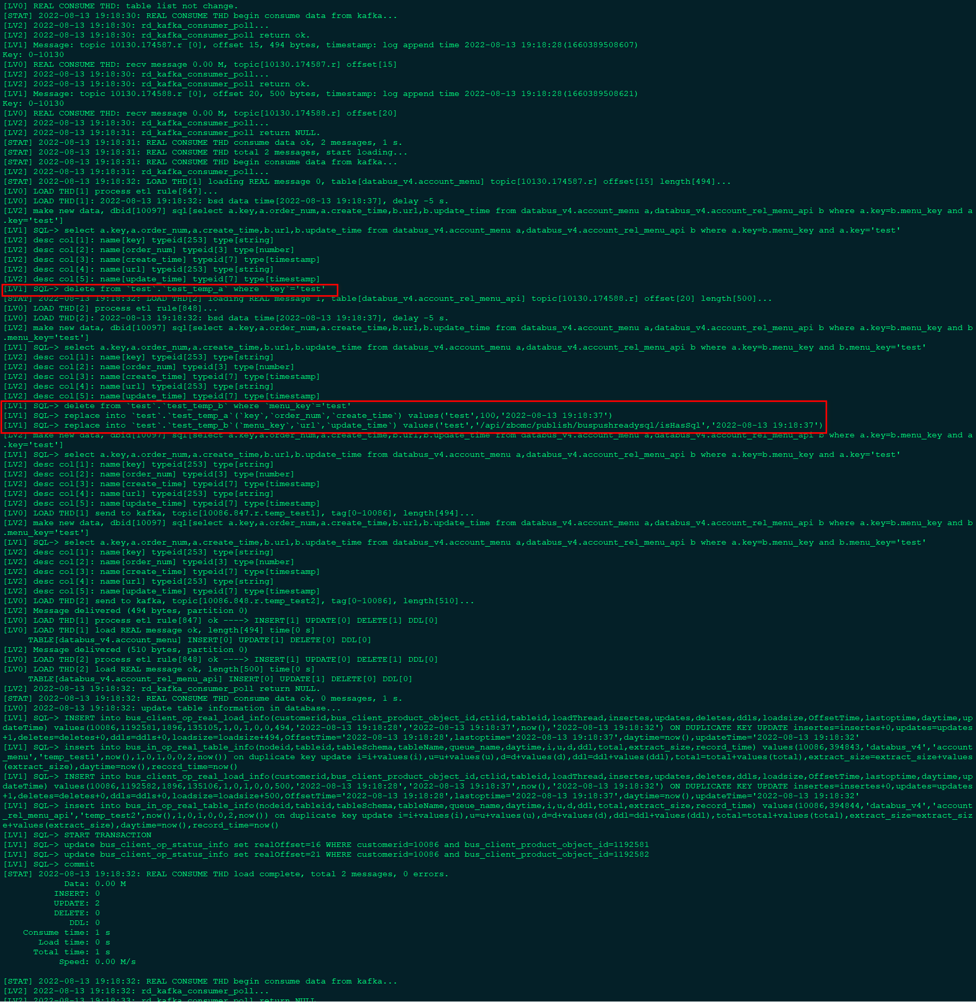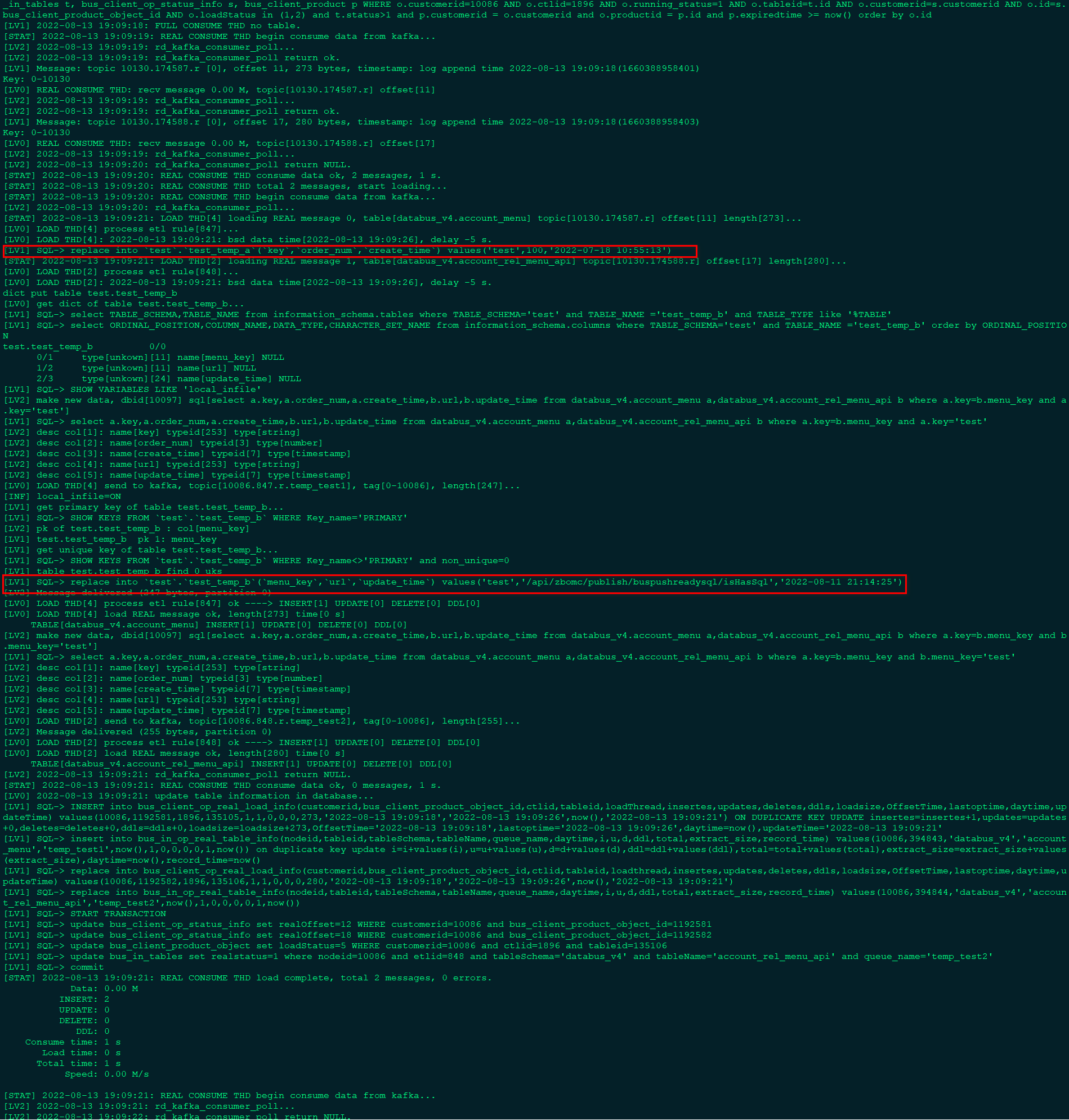 etl增加临时表模式,bus_client_main_control_properties的参数temp_table_mode设置为1时开启临时表的模式,需要先为bus_client_product_object的每一个对象创建一个临时表,消费出来的数据往临时表里进行装载,同时用etl的sql语句查询临时库生成新的数据发送到新的topic,临时表目前只支持mysql,临时表的表名设置到bus_client_product_object_properties的temp_table_schema和temp_table_name