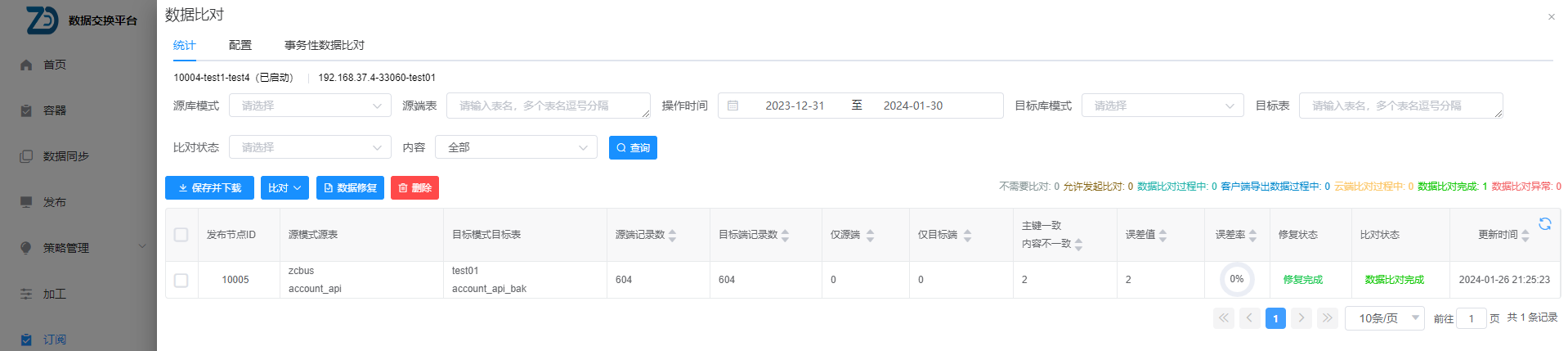 查看数据比对的结果统计信息,并可对数据进行修复