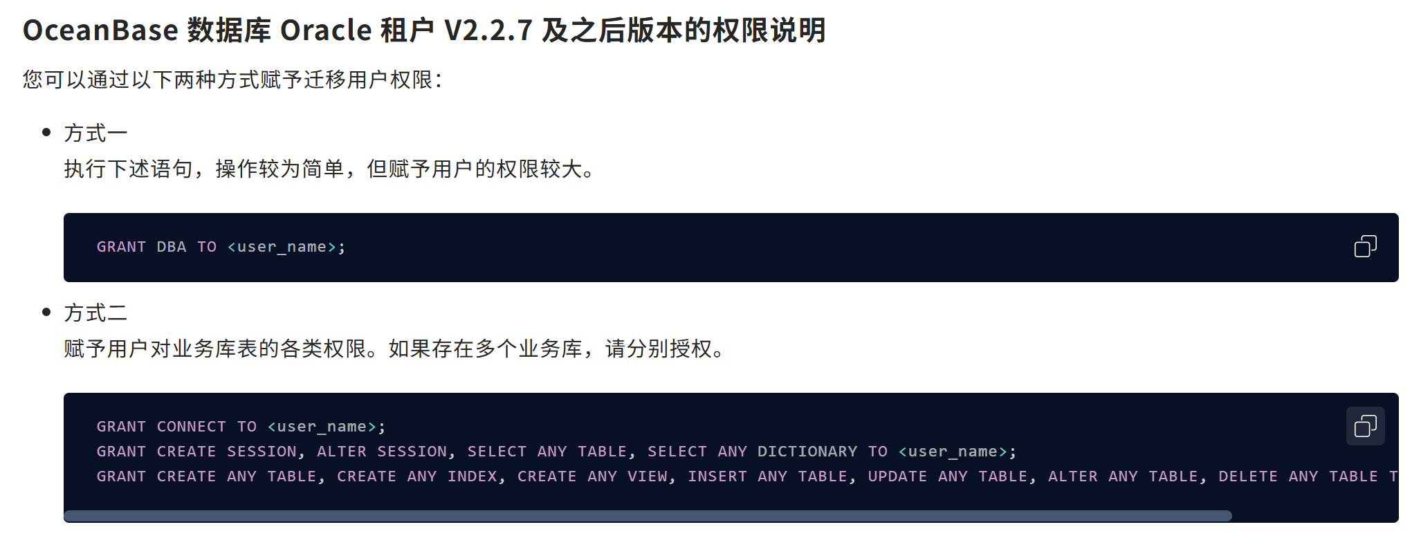4.OceanBase各个版本之间权限视图不一致,无法细致区分,DBA权限可规避该问题。