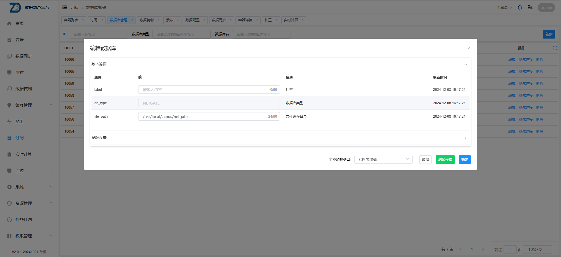 例如:订阅完成后该文件缓存路径下为文件为: [root@5a97bb93b293 netgate]# ll /usr/local/zcbus/netgate [root@5a97bb93b293 netgate]# ll demo.test.0.bsd demo.test.1.bsd demo.test.2.bsd demo.test.3.bsd demo.test.4.bsd demo.test.no.tmp 其中用户名为demo,表名为test, demo.test.no.tmp为该订阅的控制文件,文件序号最大是4,所以该控制文件内容为5 注意:订阅为NETGATE模式下,每张订阅表都会生成一个对应的tmp控制文件。不可在订阅停止的状态下删除此文件,否则数据文件会重新从demo.test.0.bsd开始生成。1.3 网闸摆渡