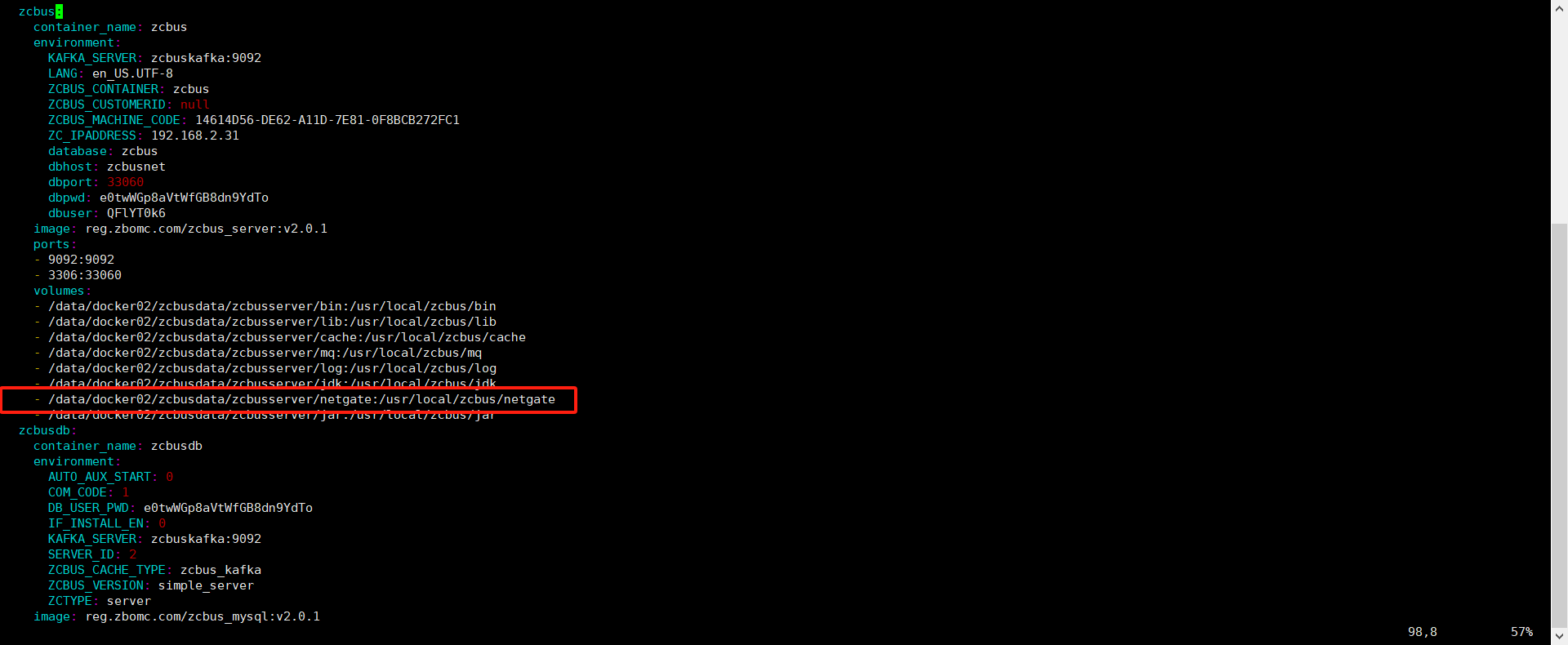 通过修改docker-compose.yml文件,将docker容器内/usr/local/zcbus/netgate目录映射在主机的/data/docker02/zcbusdata/zcbusserver/netgate目录下: