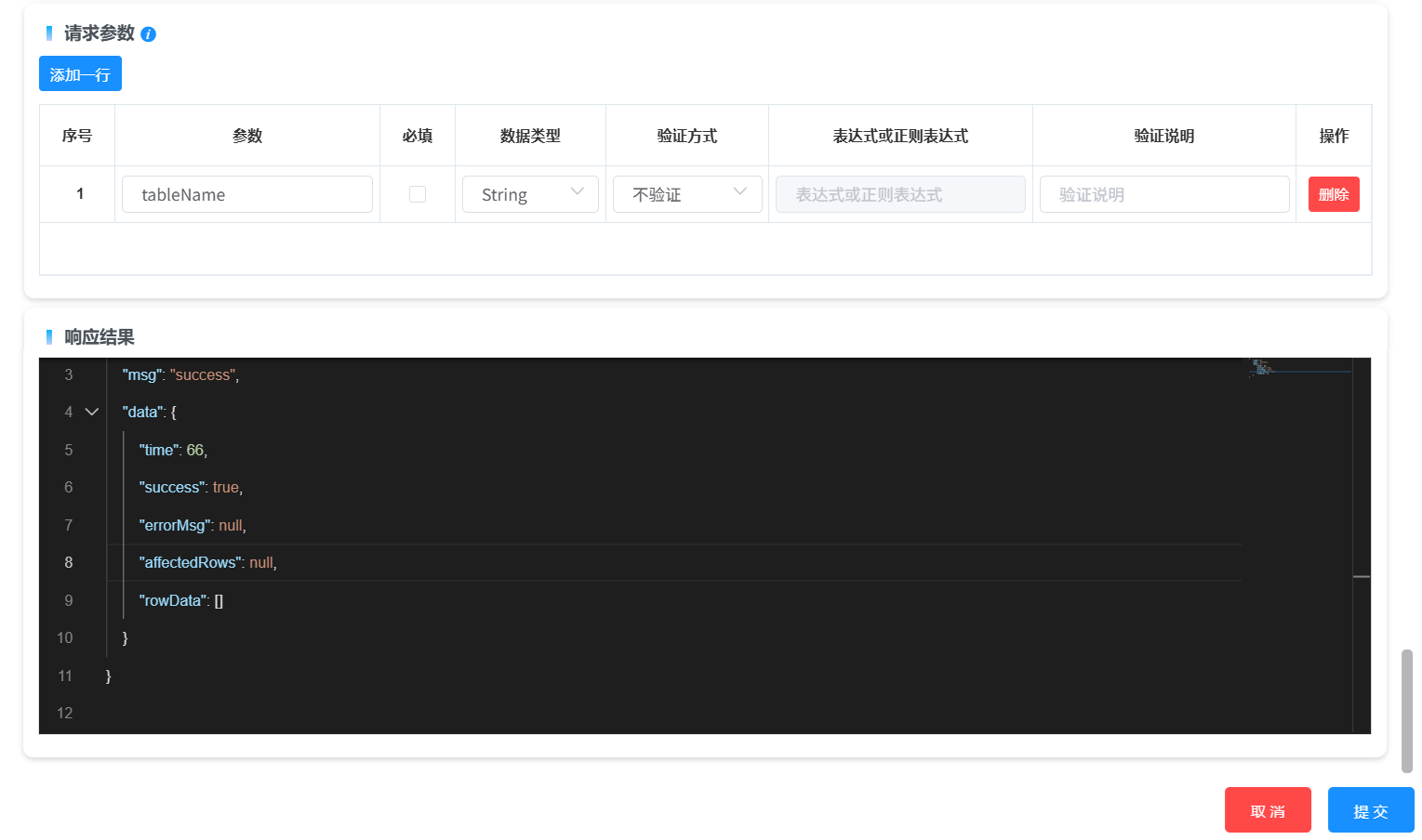 - 请求参数:设置SQL语句运行所需的参数值,设置的参数格式与SQL语句中的参数个数需要保持一致。通过点击“添加一行”按钮,在表格中增加参数,然后在表格中填写参数名称以及其他信息。
