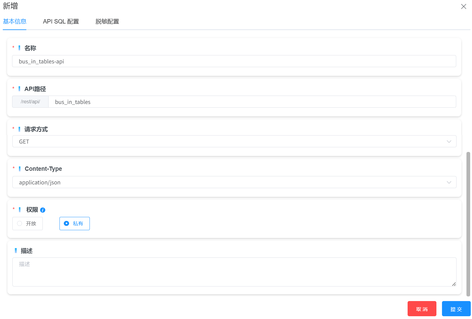 在基本信息页签中,设置名称、API路径、请求方式、Content-Type、权限和描述信息。其中,请求方式的选项包括POST和GET。权限分为的选项包括开发和私有,通常情况下,选择私有选项,设置私有后,API服务需要授权后,才能上线。