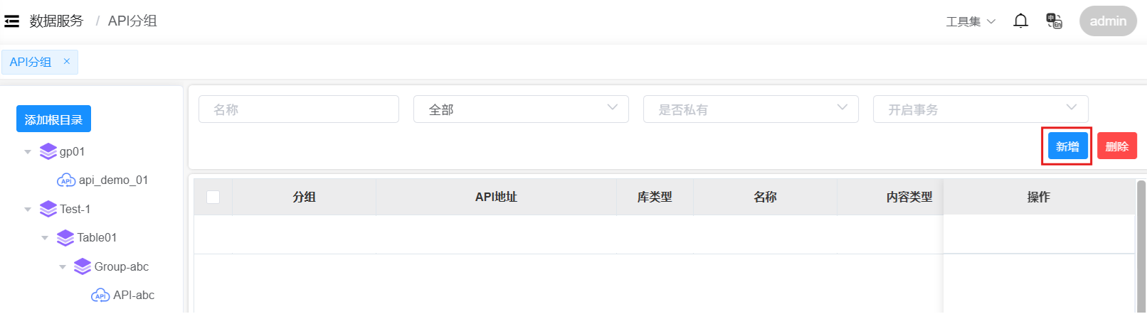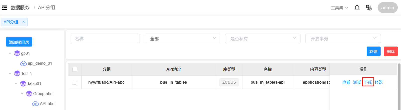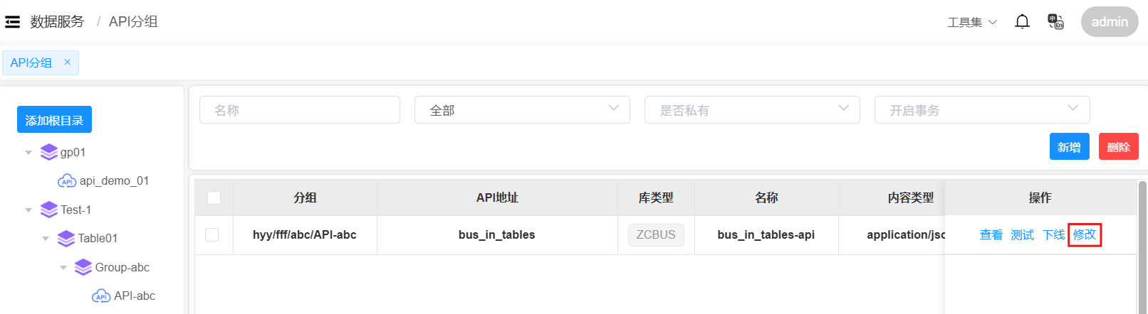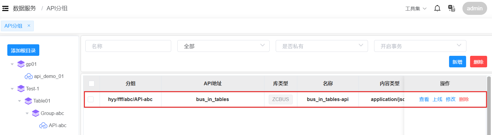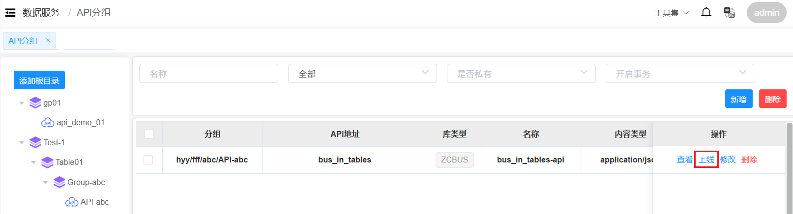返回API分组页面,在目录中点击API分组名称,进入该分组的API服务列表页面。