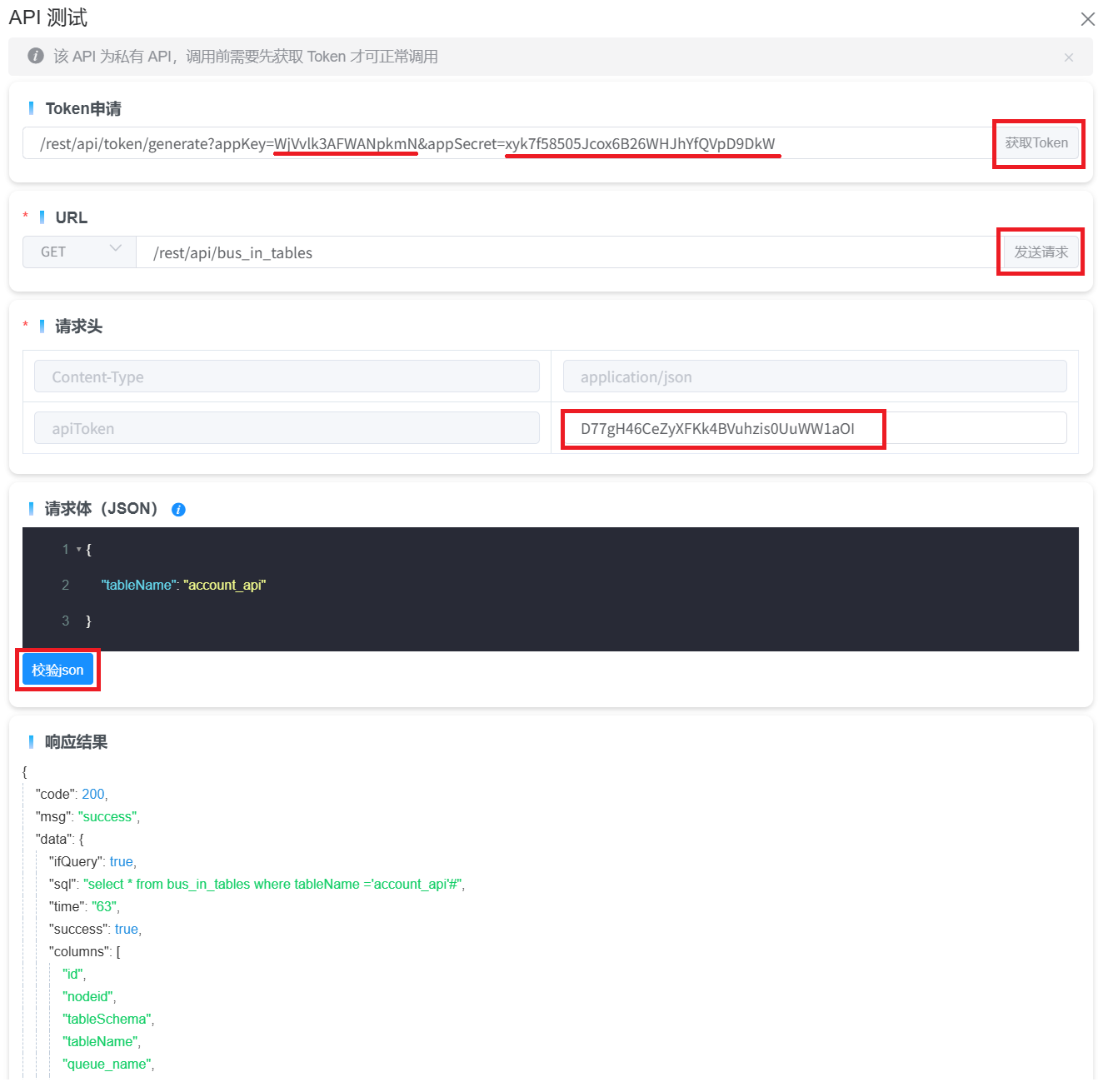 替换完成后,点击“获取Token”按钮,系统会在“请求头”的apiToken字段中显示申请的Token。