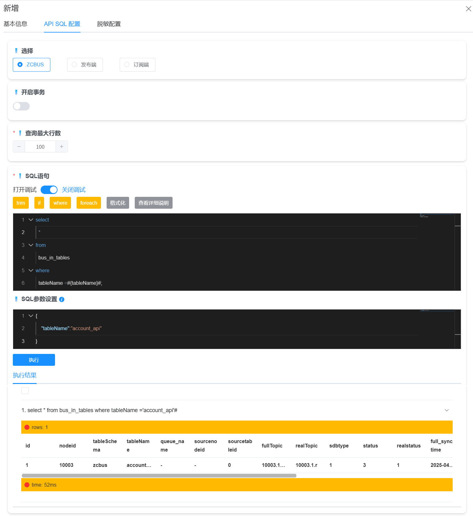 - 打开调试或关闭调试:当需要对填写SQL语句进行调试时,开启调试功能。
