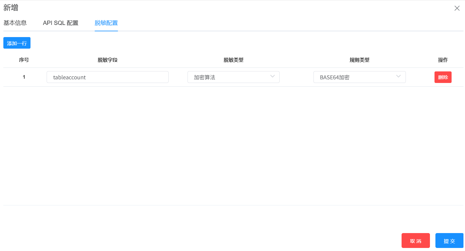在列表中,填写脱敏字段,选择脱敏类型和规则类型后,即可完成一行脱敏配置。当需要再添加一行脱敏设置时,点击“添加一行”按钮,可在列表中添加一行。