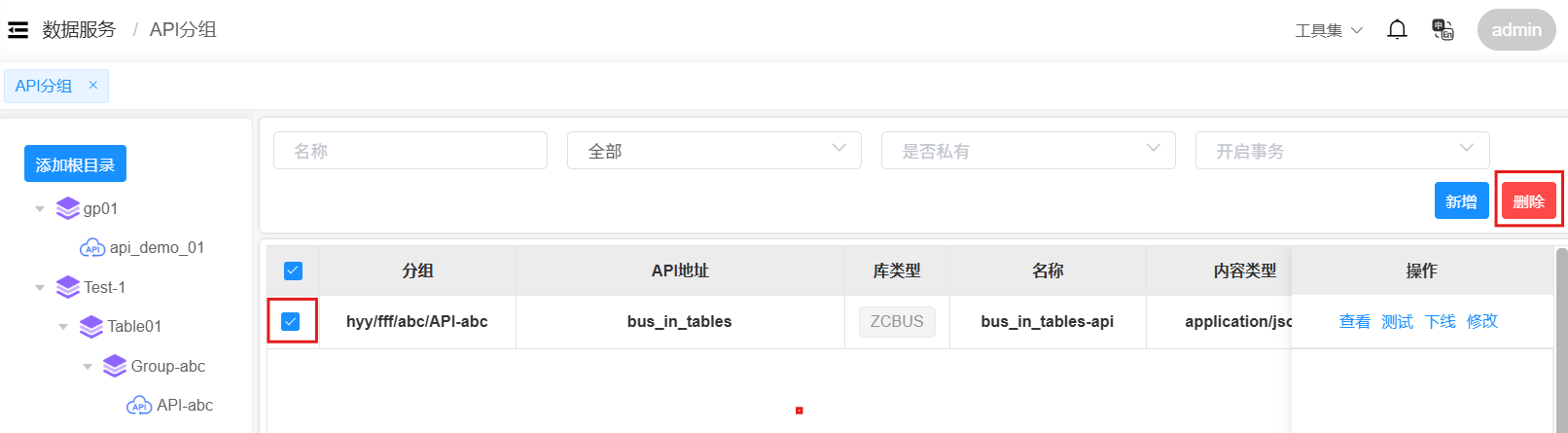 管理员可以删除API分组中的API服务。