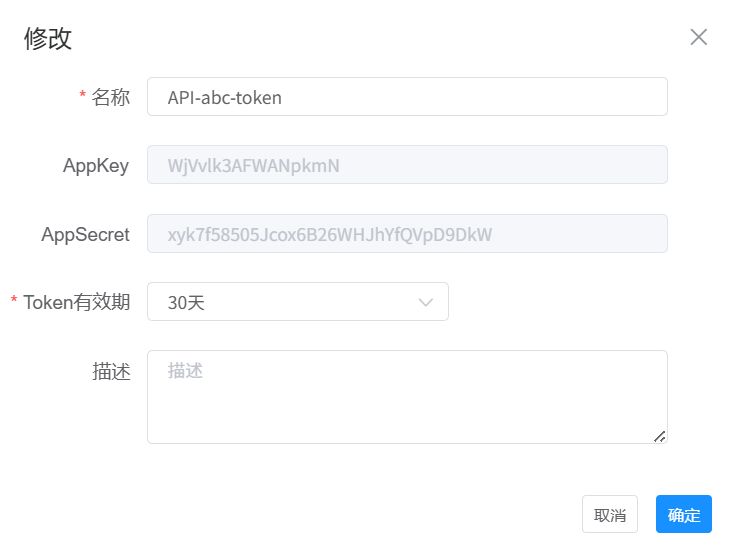 根据需要修改授权名称、Token有效期,以及描述信息后,点击“确定”按钮,完成API授权的修改。