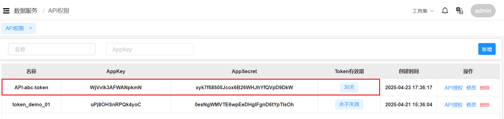 设置名称、Token有效期和描述信息后,点击“确定”按钮,完成API授权的新增。在API授权列表中,将会显示系统自动生成的API授权的AppKey和AppSecret信息,如下图。