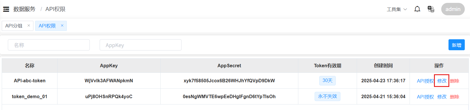 管理员根据需要修改API授权的相关信息。