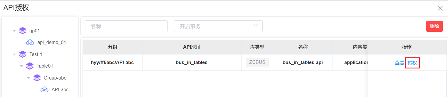 在API服务列表中,点击待绑定授权的API服务对应的操作列 “授权”链接,弹出授权对话框。