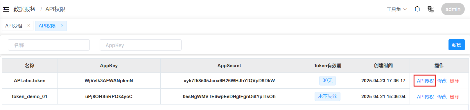 系统为私有API服务提供了新增授权和绑定授权等功能,方便管理员为API服务提供AppKey和AppSecret信息, 并设定Token的有效期。